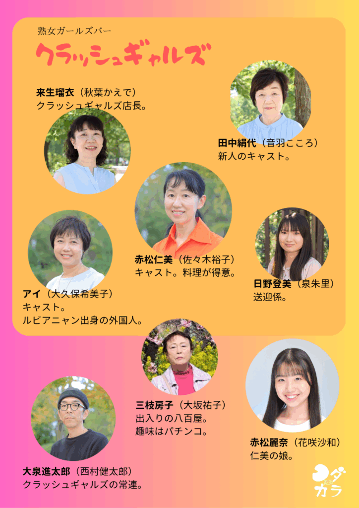 舞台2025.08.20『ひとみのチャーム』登場人物は? 『ひとみのチャーム』公演情報・チケット予約はこちら>> 『ひとみのチャーム』 熟女ガールズバー「クラッシュギャルズ」は、柏駅近くの路地裏にある。熟女でギャルズって矛盾してない?と仁美は思いながらも、今夜もチャーム(お通し)を仕込む。仁美の料理は常連にも人気で、お店はそれなりに繁盛していた。 しかし、家族には内緒にしていたはずが、仁美の娘が店に訪れ大騒ぎに。さらに、開店二周年の記念イベントを前に、突然のオーナーからの閉店宣言! キャストに入れあげた常連の暴走。国に帰ることになった外国人。いつも具合が悪そうな新人。そして、オーナーと不倫関係だった雇われママ。次々と巻き起こる騒動に、仁美は巻き込まれていく。 結婚して、子供ができて、料理だけは上手くなった。「幸せ」だと思う。だけど、何か物足りなさを感じていた仁美にとって、熟女ガールズバーは大切な場所だった。 仁美たちは、閉店を免れるための作戦を立て、二周年記念イベントの準備に取り掛かる。